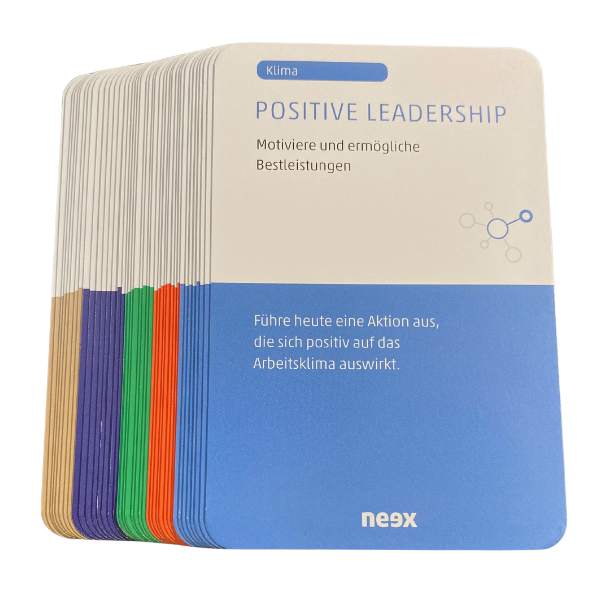 Positive Leadership and Psychological Safety is structured into five dimensions that are equally important for your success. Based on this model, we have developed inspirational cards for you, that help you to implement the theory easily and effectively into your everyday activities and train your «positive leader» muscles. Simply draw a card – preferably on a regular basis – and off you go: Get inspired by the input on the front side of your card. Flip your card to find a short and concise explanation of how you can put theory into practice. Oh, and there is an additional goodie: each card comes with a QR code which leads you to in-depth, valuable information that we‘ve compiled for you. Depending on what is on your mind at that moment, you can of course choose cards according to your preference and mood. The categories are: Atmosphere, Relationships, Communication, Purpose and Psychological Safety.